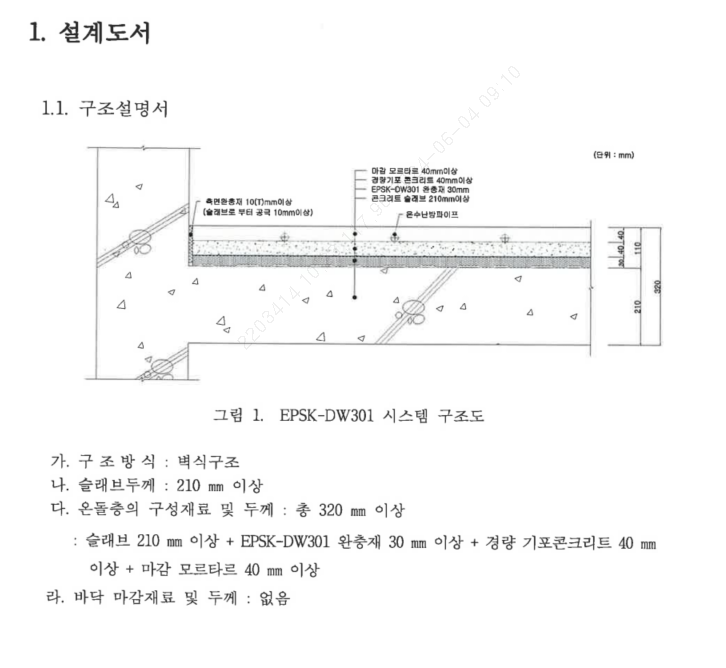 -법령으로 제시하는 바닥충격음 차단구조는 다양하지만, 대부분의 아파트에서는 아래와 같은 단면도 형태로 시공한다.