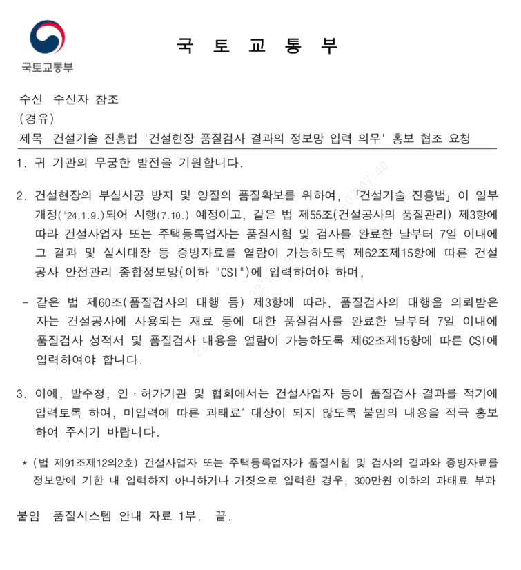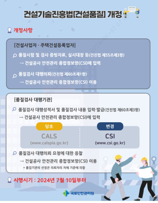어느날 CSI에 상기 이미지와 같은 공고가 떳다, 건진법 제55조 제3항 개선에 따른 건설공사 안전관리 종합정보망에 품질관련 자료를 업로드 하라는 것이다.