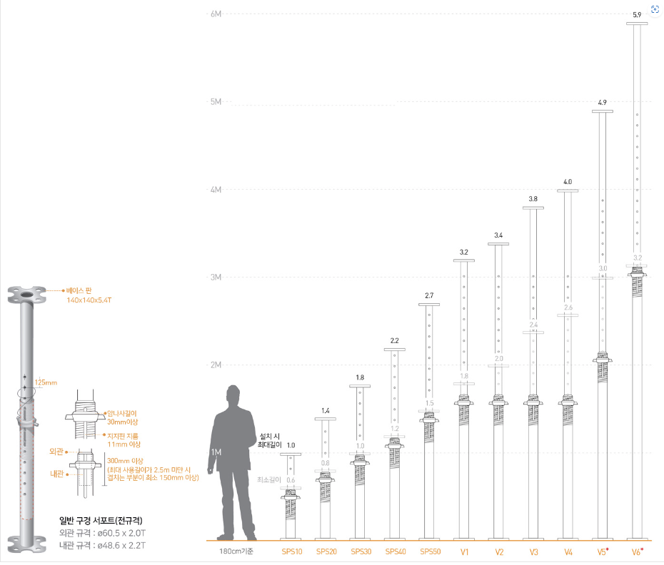 파이트 서포트는 v1~v6까지 다양한 규격의 동바리로 존재한다.