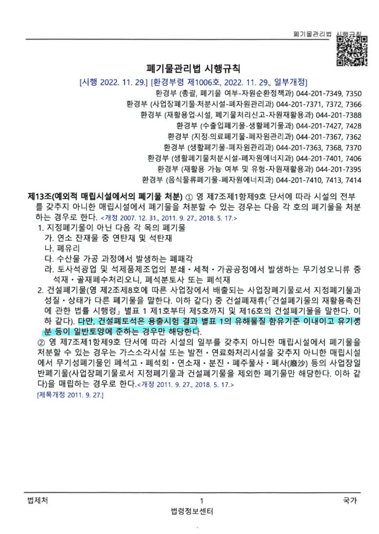 2) 폐기물관리법 시행규칙 제13조(예외적 매립시설에서의 폐기물 처분)의 2항을 보면 "다만 건설폐토석은 용출시험 결과 별표 1의 유해물질 함유기준 이내이고 유기성분 등이 일반토양에 준하는 경우에만 해당한다"라고 나와있다.