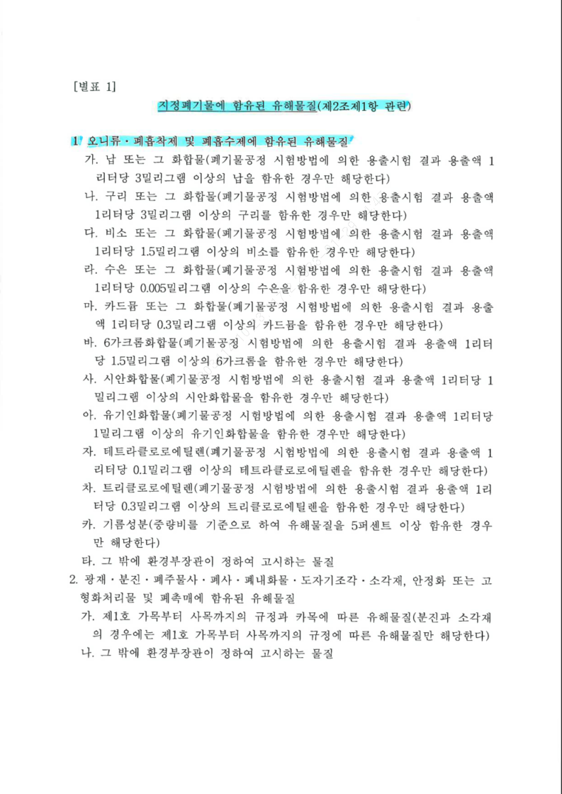 1)[별표1] 지정폐기물에 함유된 유해물질(제2조1항) 관련근거