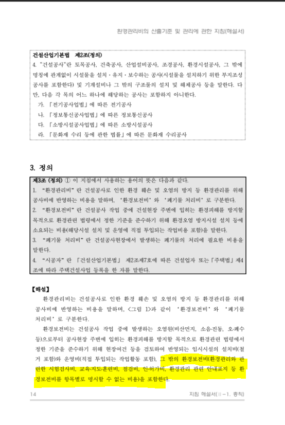 환경관리비"란 건설공사로 인한 환경 훼손 및 오염의 방지 등 환경관리를 위해 공사비에 반영하는 비용을 말하며, '환경보전비'와 '폐기물 처리비'로 구분한다 /환경관리비 산출기준 및 관리에 관한 지침(https://www.law.go.kr/%ED%96%89%EC%A0%95%EA%B7%9C%EC%B9%99/%ED%99%98%EA%B2%BD%EA%B4%80%EB%A6%AC%EB%B9%84%EC%9D%98%EC%82%B0%EC%B6%9C%EA%B8%B0%EC%A4%80%EB%B0%8F%EA%B4%80%EB%A6%AC%EC%97%90%EA%B4%80%ED%95%9C%EC%A7%80%EC%B9%A8/(2018-528,20180830))