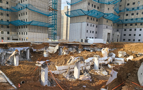 - 콘크리트 타설 및 성토 등 주요 공정이 마무리된 지하주차장* 구간의 지하1층 상부 슬래브(붕괴 면적 약 830㎡) 및 지하2층 상부 슬래브(붕괴 면적 약 140㎡)의 붕괴가 발생되었으나, 밤 늦은 시간(23:30경)으로 사고 당시 진행되는 공사 등이 없어 인명피해는 발생되지 아니함
