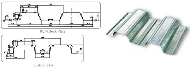 •데크플레이트 (Deck Plate) : 아연도금 강판, 선재 등 강재류를 요철 가공한 것으로서 바닥구조에 사용하는 파형으로 성형된 판을 말한다. 거푸집용과 구조용이 있으며, 거푸집용으로는 골형 및 평형 데크플레이트가 있으며, 구조용으로는 철근트러스형 및 합성 데크플레이트가 있음