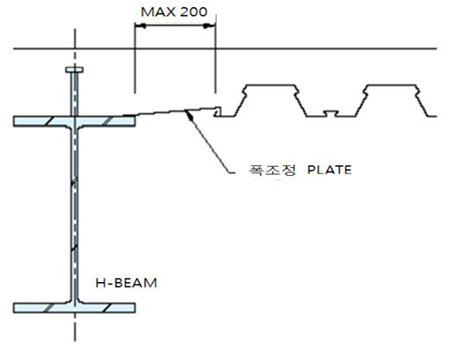 •필러플레이트 (Filler Plate) : 데크플레이트 설치 시 보와 데크플레이트 사이의 공간을 메우기 위한 부재로 판 두께는 모 데크플레이트 보다 두꺼운 판재를 사용한다.