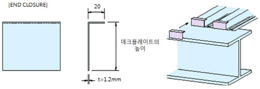 •엔드 클로져 (End Closure) : 콘크리트 타설시 콘크리트의 누출을 방지하기 위하여 데크플레이트 단부 개구면에 설치하는 데크플레이트 부속자재를 말한다. 콘크리트가 데크플레이트 개구면으로 새어나오는 것을 방지하는 역할을 수행한다.