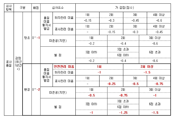 관련된 사항은 품질미흡통지서 등 감점요인이 발생할시 감점되는 정도가 바뀐 사항인데