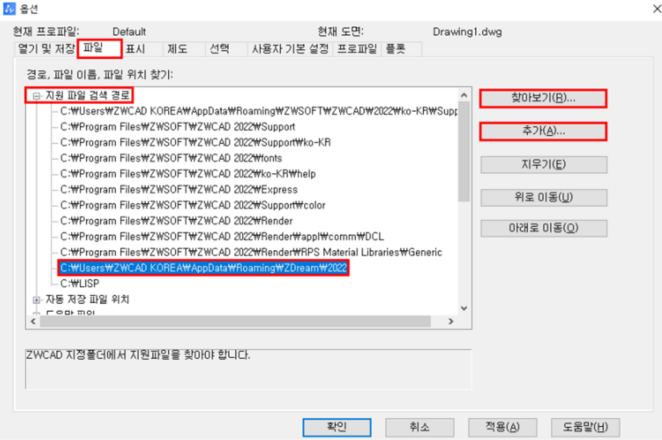 -캐드를 실행 후 명령어 OPTION을 친 이후 파일의 경로를 확인한다